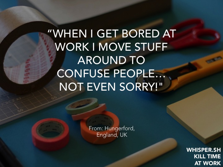 Die Emails sind beantwortet, der Schreibtisch ist aufgeräumt, die zweite Tasse Kaffee leergetrunken. Draußen scheint die Sonne. Noch drei Tage bis Freitag. Warten auf Feedback aus der Fachabteilung. Was passiert, wenn wir uns auf der Arbeit langweilen? Einige haben ihre Ideen gegen Langeweile auf der Arbeit auf „Whisper“ geteilt, die besten Ideen haben wir hier festgehalten: