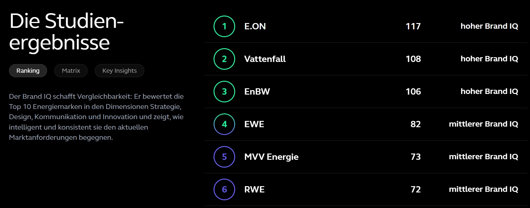 Unser Barometer zeigt, wie intelligent eine Marke geführt wird und bewertet die zehn umsatzstärksten Marken einer Branche in den Dimensionen Strategie, Design, Kommunikation und Innovation. Ein höherer Brand IQ bedeutet eine höhere Wettbewerbsfähigkeit. Menschen mit einem IQ über 130 gelten als hochbegabt – und genau dieses Level wollen wir bei Marken sehen. Zwischen Klimaneutralität, KI-Hype und Kund:innen, die alles bitte digital, günstig und sofort wollen, geht’s in der Energiebranche ordentlich zur Sache. Der Brand IQ 2025 zeigt, wer wirklich unter Strom steht – und wer sich kaum aus dem Schatten des Umspannwerks traut.