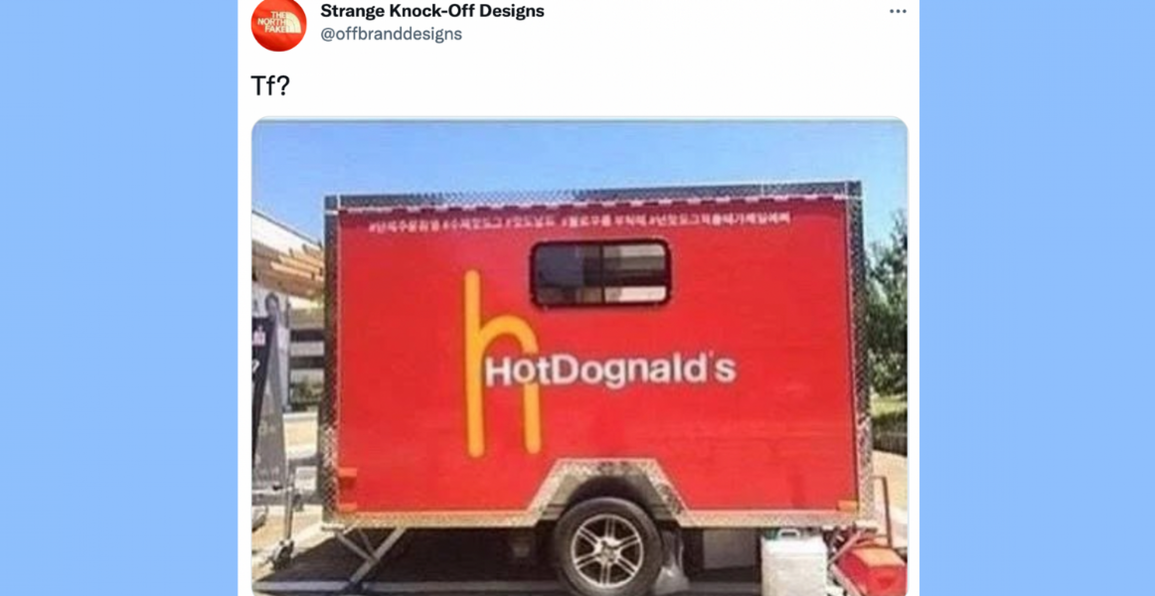 Prongels, Kat-Kot, The South Face. Nein, wir haben uns hier nicht verschrieben. Und auch nichts durcheinander gebracht. Die drei Namen, die ihr da lest, existieren wirklich. Und zwar als Namen von Produkten, die hier und da immer wieder in Lädchen auf der ganzen Welt auftauchen. Es gibt nämlich so einige Firmen, die mit Nachahmungen von großen, berühmten Playern Geld machen wollen und fest daran glauben, dass es Menschen gibt, die Geld für diese „Fakes“ ausgeben. Welche absurden Nachahmungen es so auf dem Markt gibt, zeigt der Twitteraccount „Strange Knock-Off Designs“. Wir konnten uns beim Durchscrollen das Lachen nicht verkneifen und wollten euch das natürlich nicht vorenthalten. Here you go: