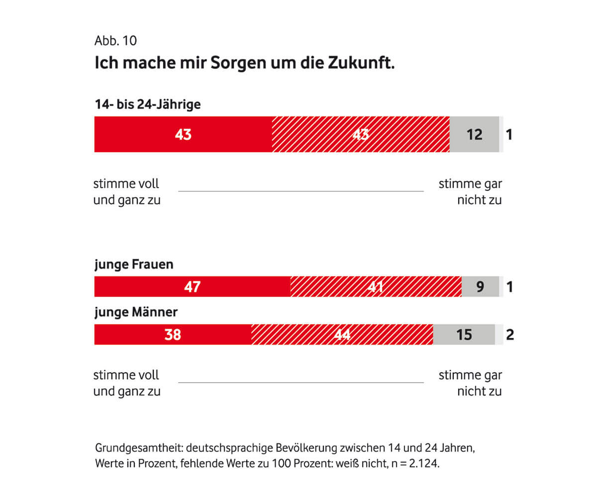 Wie die Generation Z sonst so tickt und fühlt, könnt ihr euch in den folgenden Grafiken genauer ansehen. Darin werden auch die Unterschiede zwischen Männer, Frauen und verschiedenen Bildungsgraden herausgestellt: