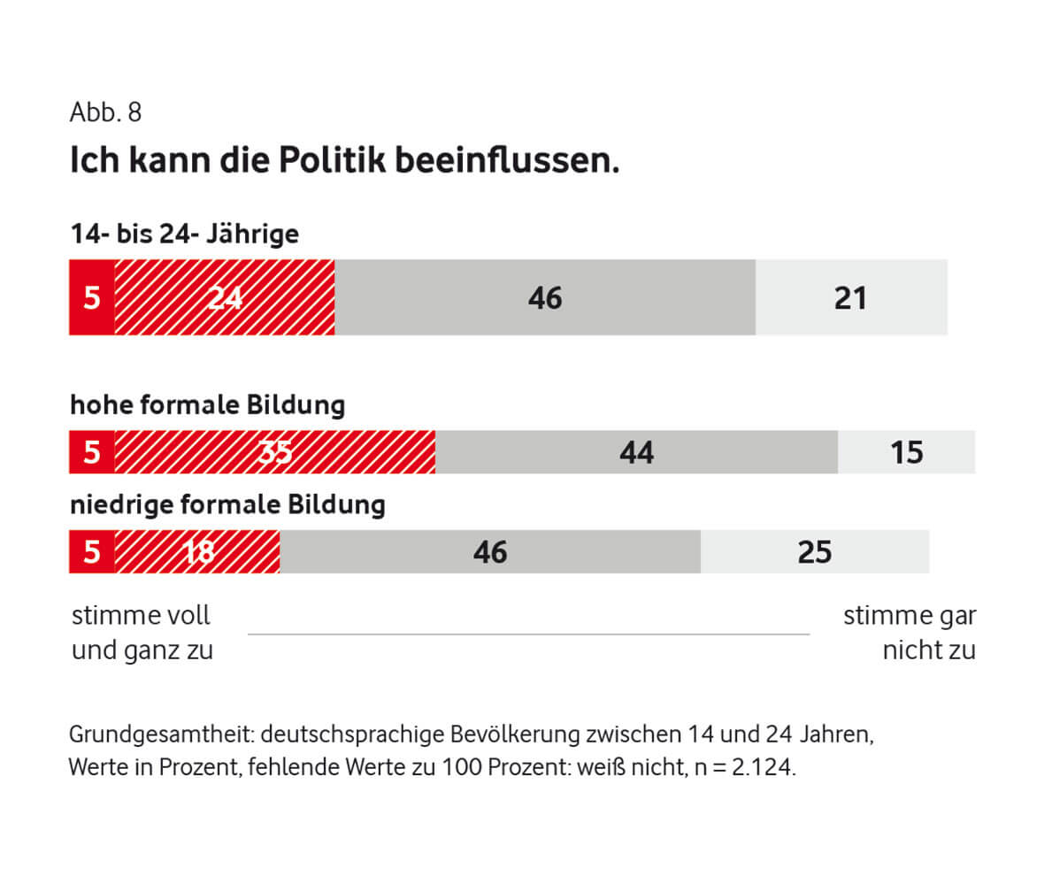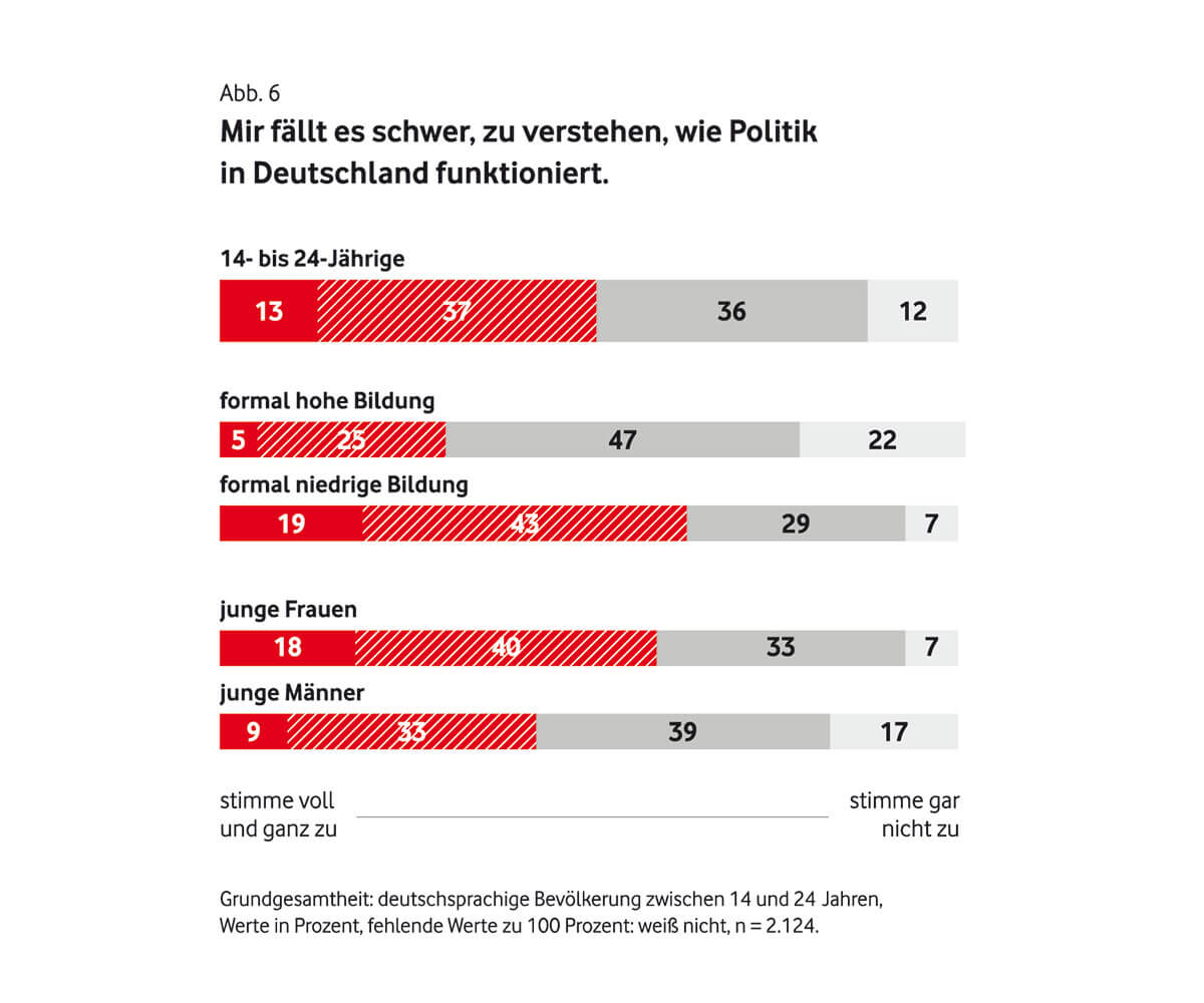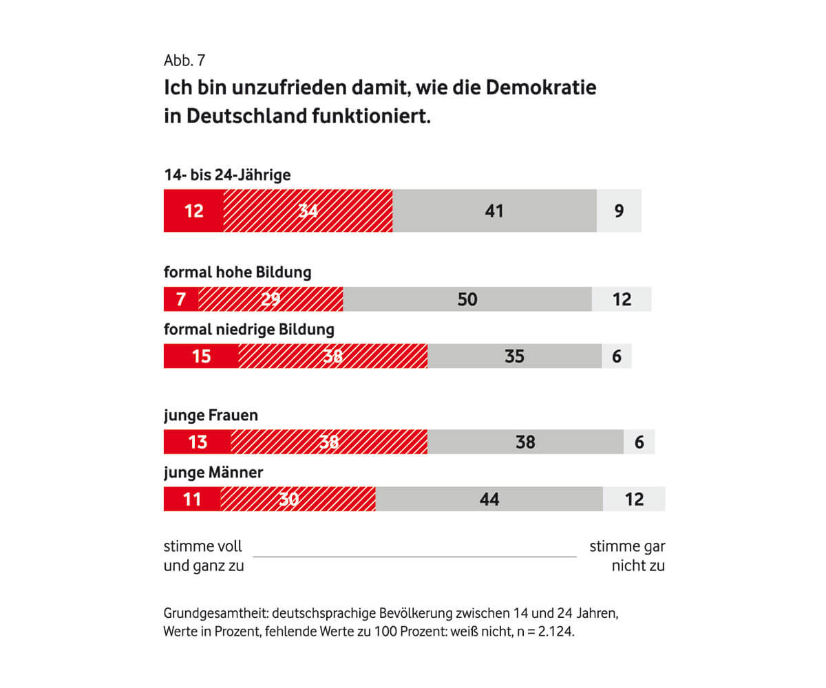 Das könnte auch damit zusammenhängen, dass lediglich 29 Prozent der Teilnehmenden das Gefühl haben, Einfluss auf die Politik nehmen zu können. Ganze 75 Prozent nehmen unsere Demokratie nämlich zu schwerfällig wahr, um auf aktuelle Krisen angemessen zu reagieren.