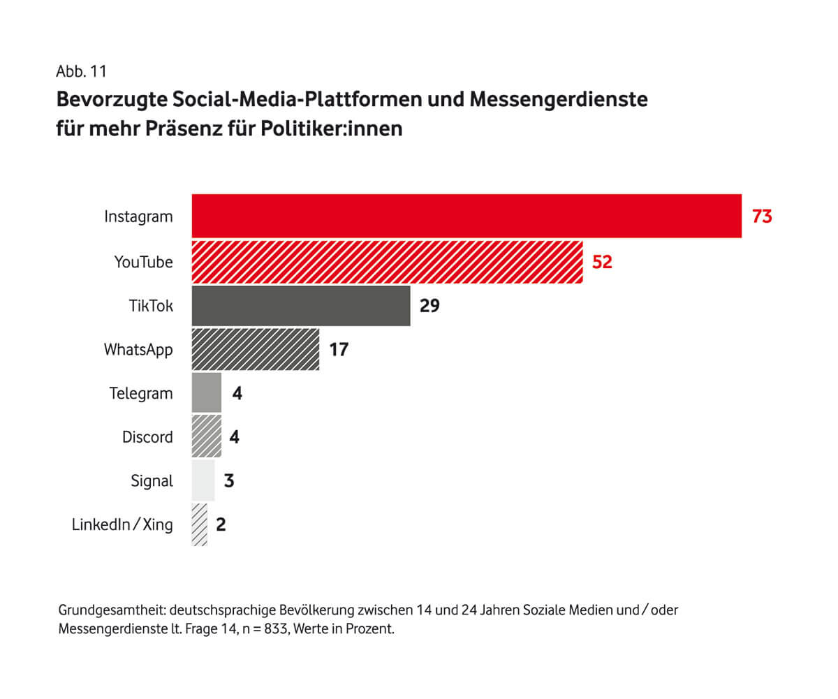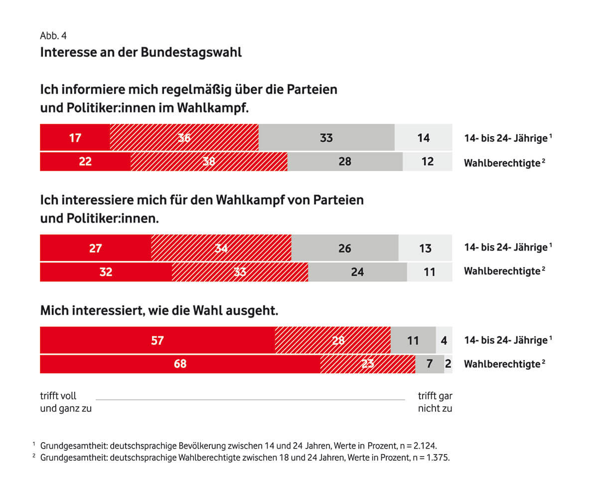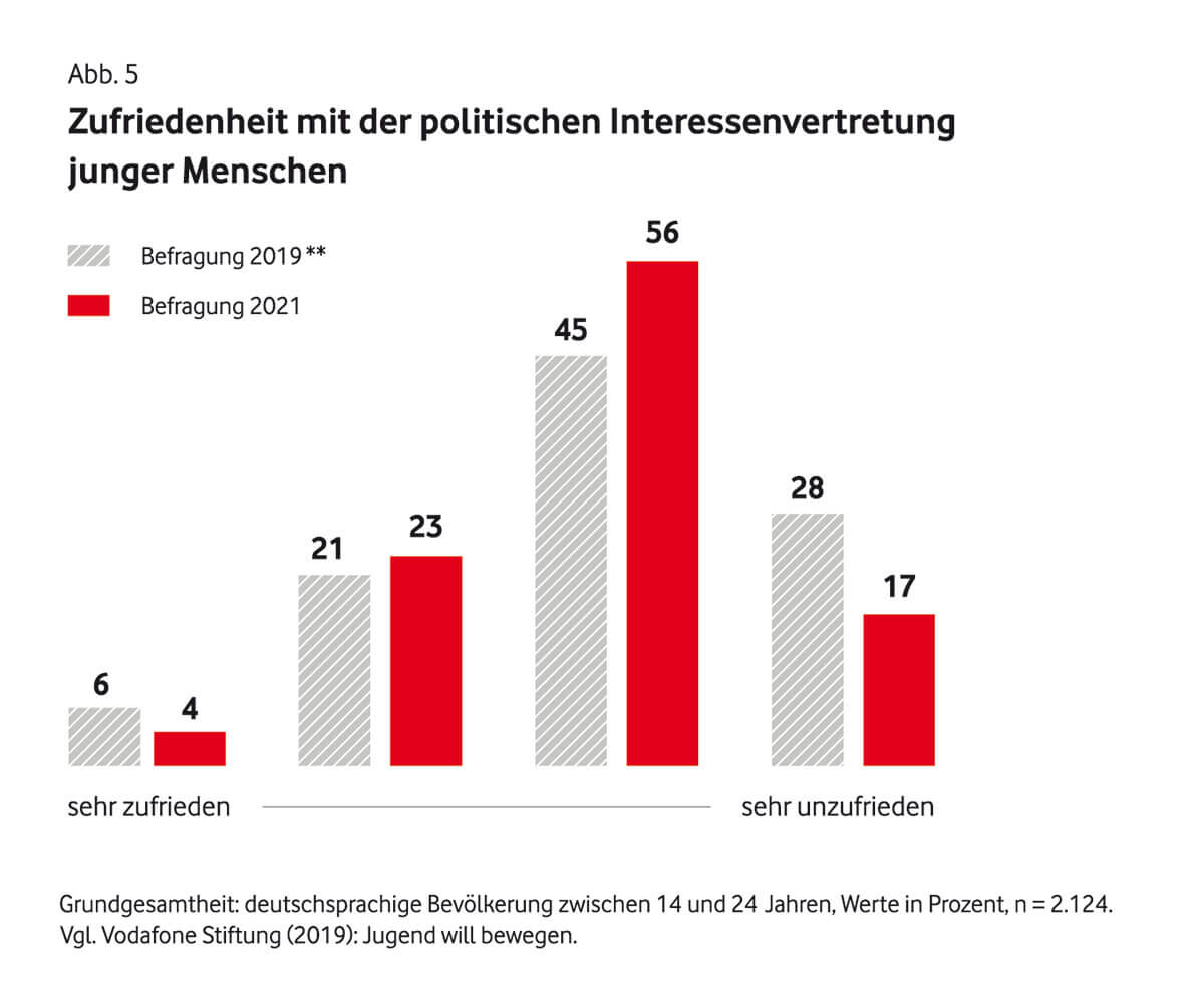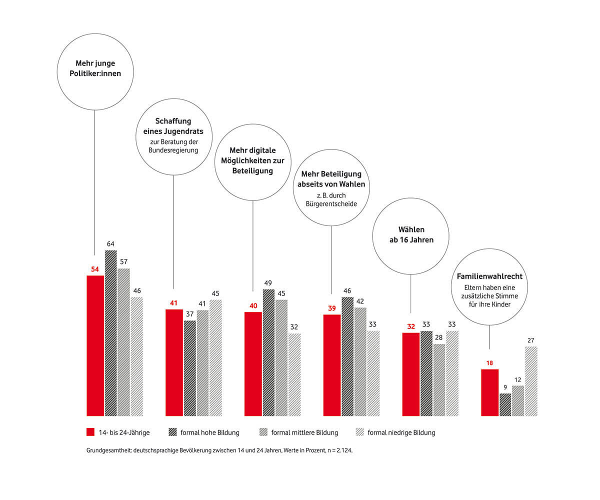 Das könnte auch damit zusammenhängen, dass lediglich 29 Prozent der Teilnehmenden das Gefühl haben, Einfluss auf die Politik nehmen zu können. Ganze 75 Prozent nehmen unsere Demokratie nämlich zu schwerfällig wahr, um auf aktuelle Krisen angemessen zu reagieren.