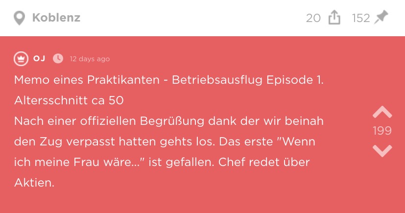 Das Dasein als Praktikant in einem Unternehmen ist eine harte Angelegenheit: Während sich auf dem Schreibtisch die Aufgaben stapeln, weil die Kollegen keine Lust haben sie selbst zu erledigen, muss man ihnen auch noch Kaffee kochen und zusehen, dass man bloß nicht negativ auffällt. Natürlich möchte man auch seine Social Skills unter Beweis stellen und mit seinen Büromitmenschen ins Gespräch kommen. Was eignet sich da besser als ein Betriebsausflug? Ein 21-jähriger Praktikant aus Koblenz hätte wohl lieber darauf verzichtet. Er lernte bei einem Offside-Event seine Kollegen so richtig kennen und teilte die Highlights des Tages auf Jodel. So viel können wir verraten: Es wird peinlich. Richtig peinlich. Alkohol sei Dank!