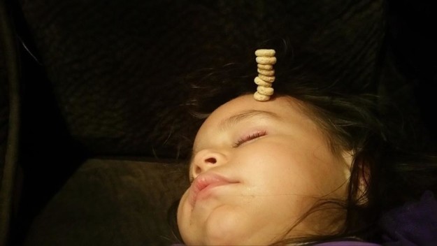 Aufgabe: So viele Cheerios wie möglich auf dem eigen Fleisch und Blut stapeln. Wer die meisten hinkriegt, gewinnt. Heraus kamen göttliche Bilder.