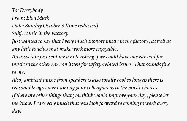 Folgendes schrieb er: „Ich wollte nur sagen, dass ich Musik in der Fabrik deutlich befürworte, sowie alle anderen Wege, die Arbeit angenehmer zu gestalten. Ein Kollege hatte mich gefragt, ob es in Ordnung wäre, mit einem Ohr Musik zu hören und das andere frei zu lassen, um sicherheitstechnische Vorkommnisse hören zu können. Damit bin ich einverstanden. Darüber hinaus ist Ambient-Musik über Lautsprecher vollkommen in Ordnung, solange die Mitarbeiterschaft mit der Musikauswahl insgesamt einverstanden ist. Falls es noch andere Dinge gibt, die eurer Meinung nach den Arbeitsalltag verbessern könnten, lasst es mich bitte wissen. Ich bin sehr daran interessiert, dass ihr euch jeden Tag auf die Arbeit freuen könnt.“
