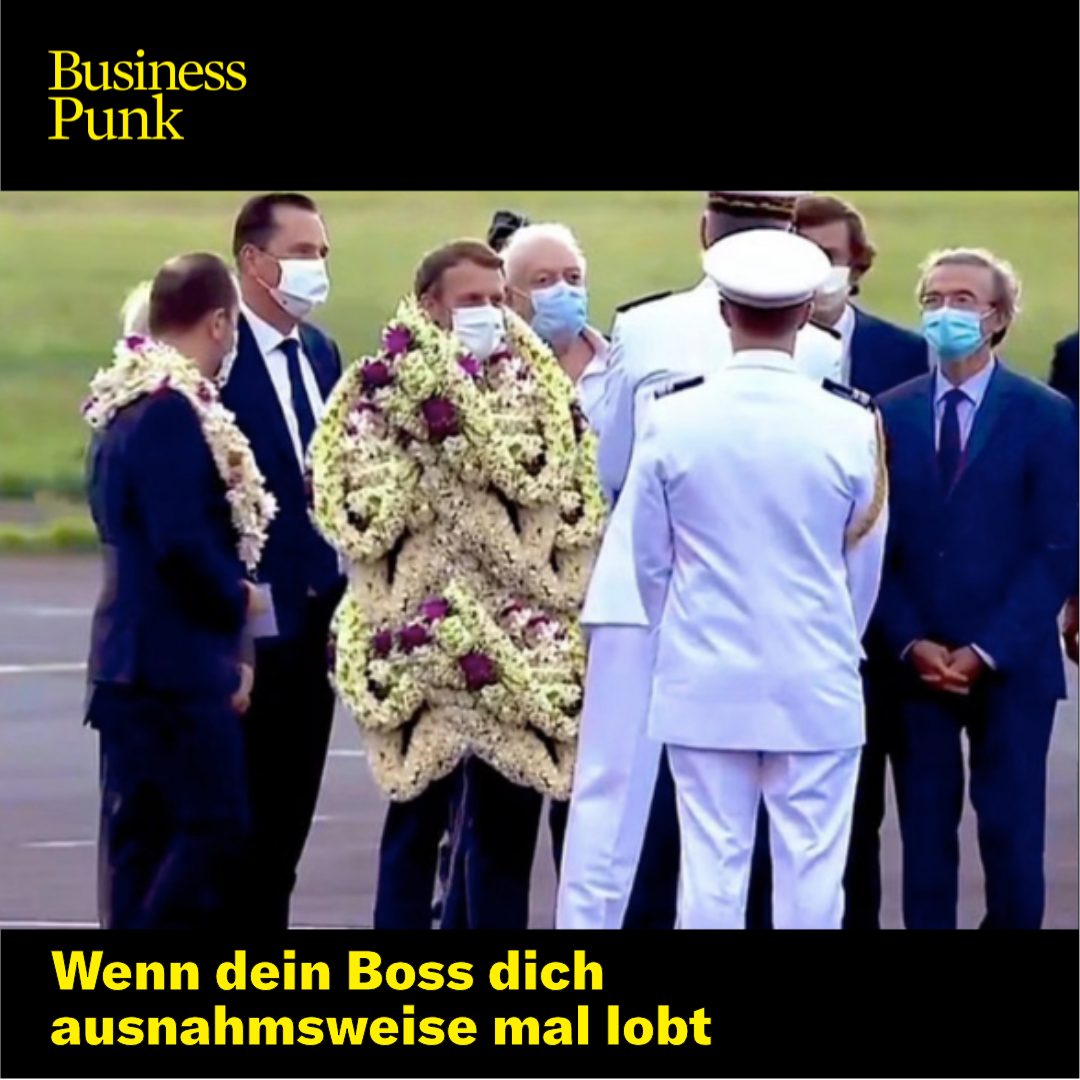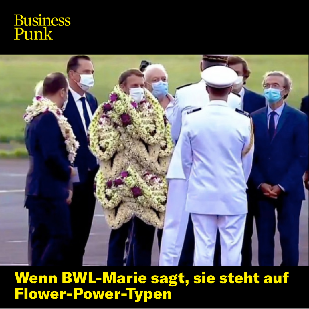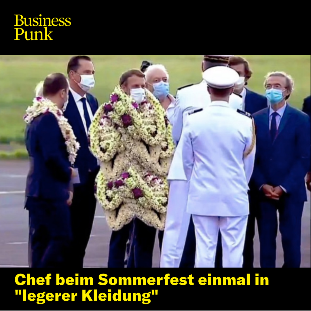 Aus den ursprünglichen Bildern von einem mit Blumen behängten Macron entwickelte sich nun ein virales Video. Darin ist Macron nicht nur mit ein paar Kränzen behangen, sein ganzes Outfit besteht quasi nur noch daraus. Und auch wenn die Bilder offensichtlich gefaked sind, bietet der Empfang die perfekte Vorlage für so einige Memes.