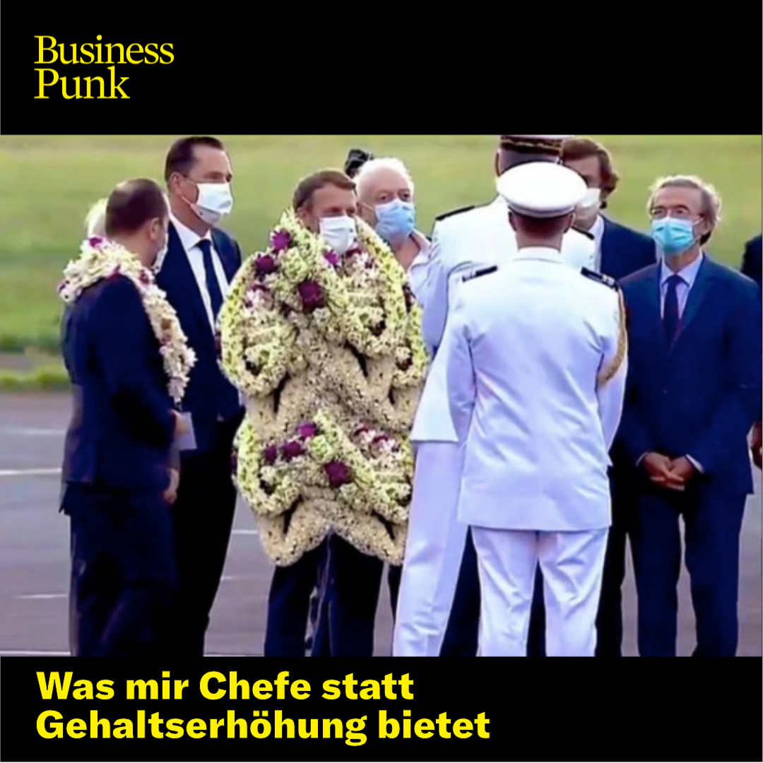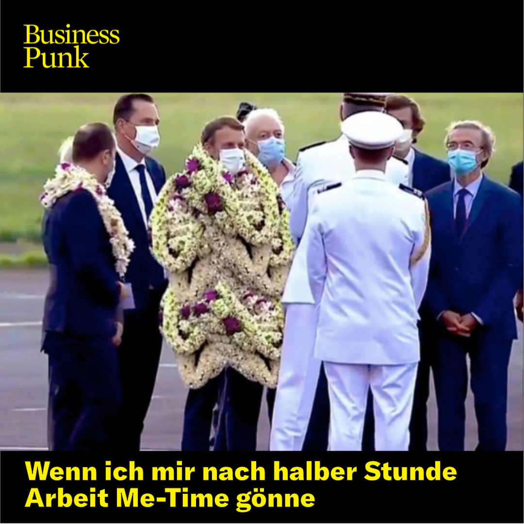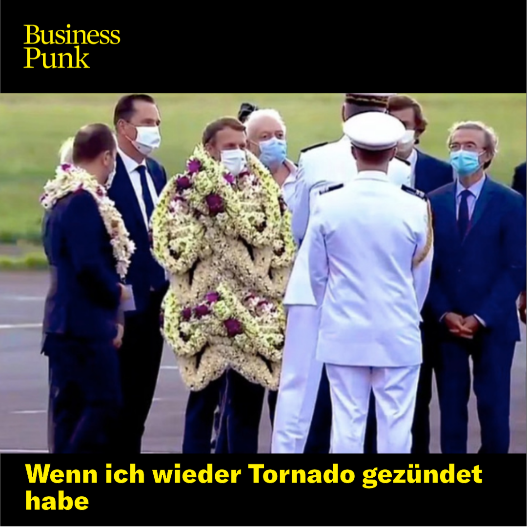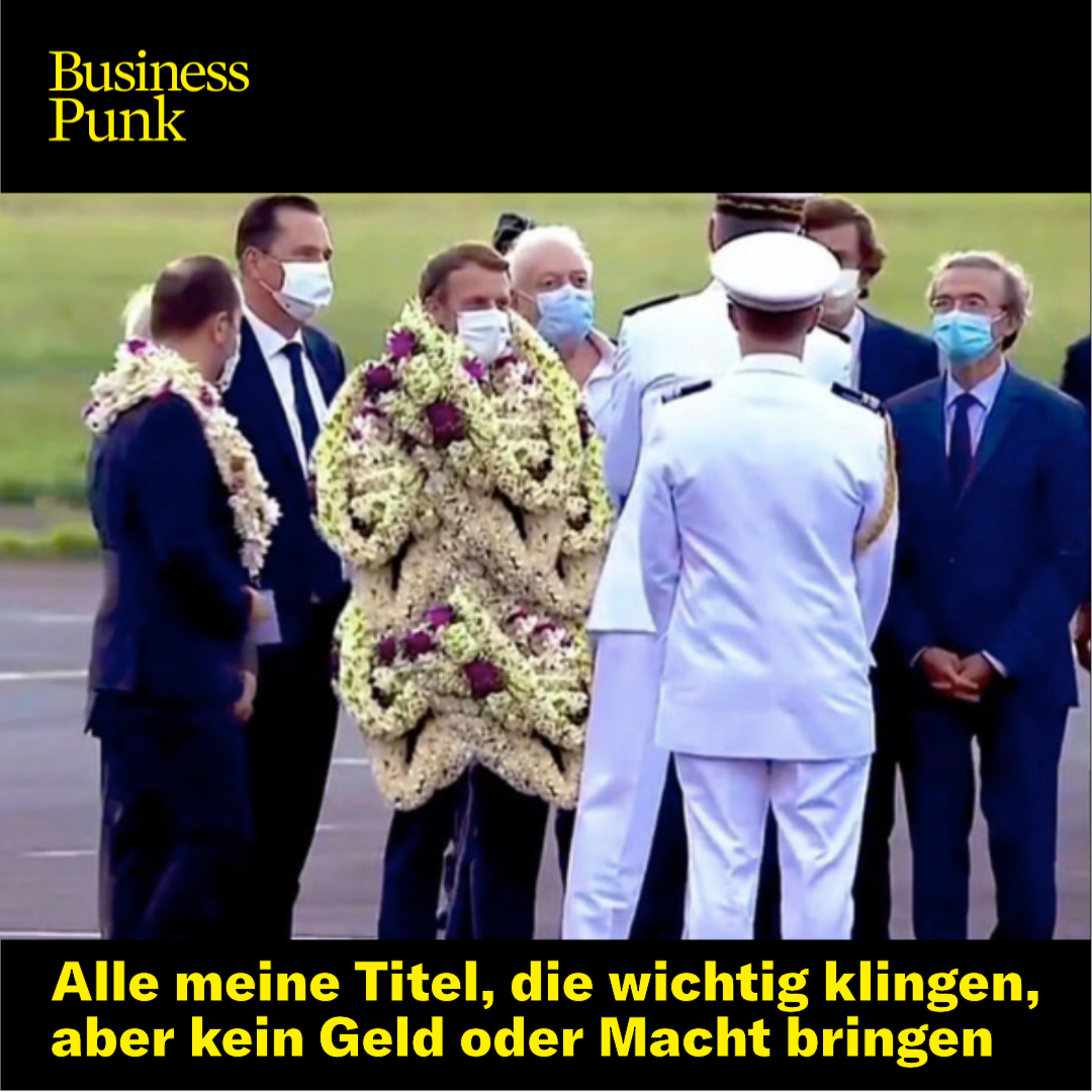 Aus den ursprünglichen Bildern von einem mit Blumen behängten Macron entwickelte sich nun ein virales Video. Darin ist Macron nicht nur mit ein paar Kränzen behangen, sein ganzes Outfit besteht quasi nur noch daraus. Und auch wenn die Bilder offensichtlich gefaked sind, bietet der Empfang die perfekte Vorlage für so einige Memes.