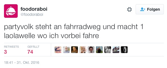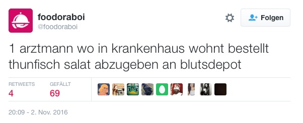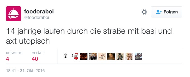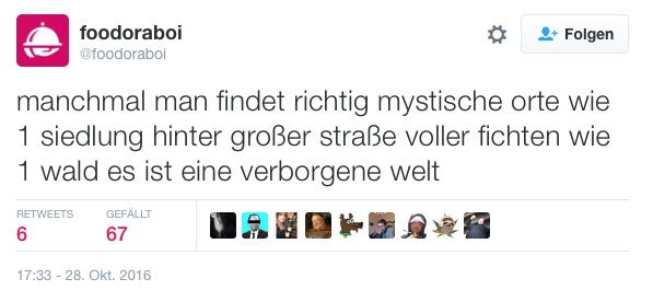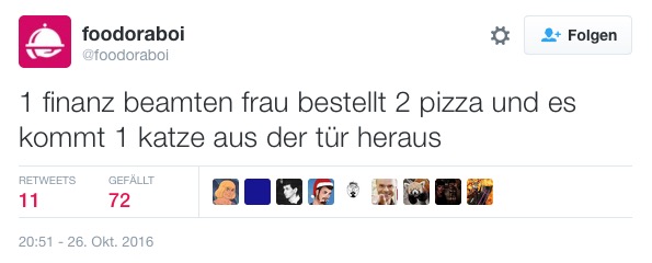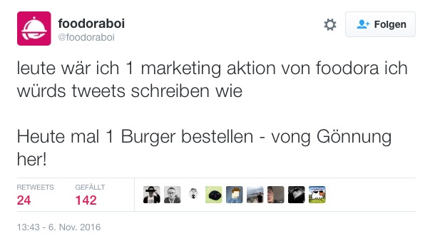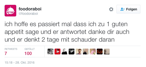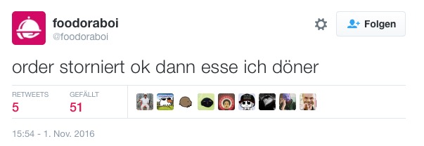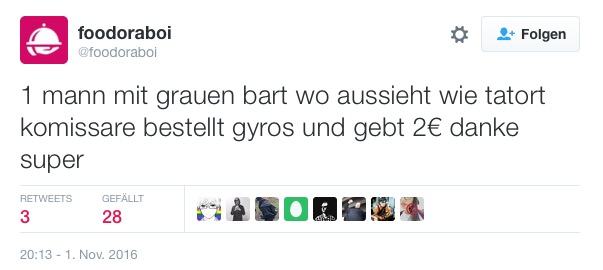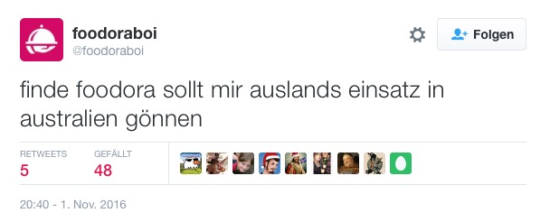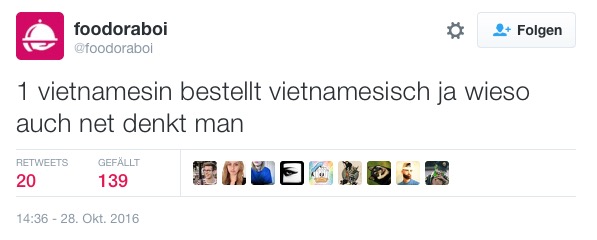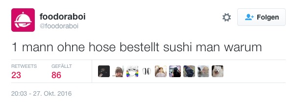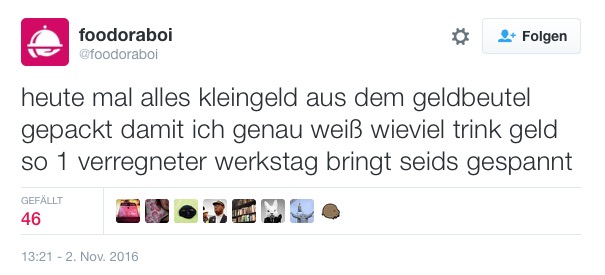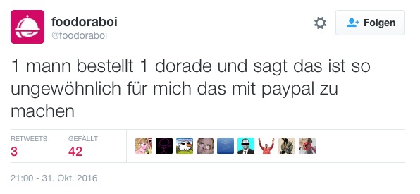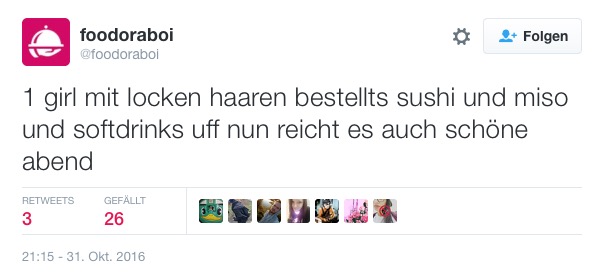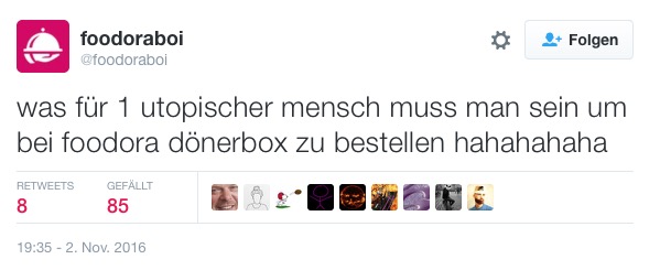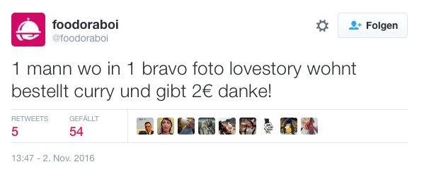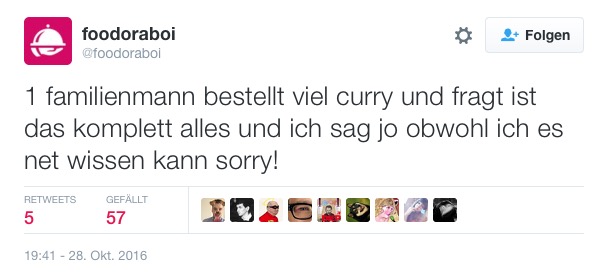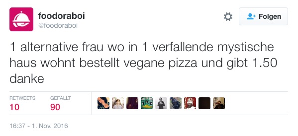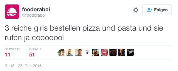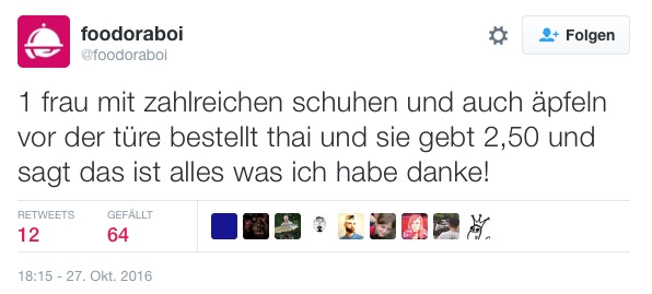 Als Food-Lieferant hat man keinen unbedingt einfachen Job. Hungrige Mäuler und davonlaufende Zeit steht bei hippen Lieferdiensten wie „Foodora“ an der Tagesordnung. Im Minutentakt Essen ausliefern, immer neue Leute bedienen und dabei die gute Laune nicht verlieren? Wie das möglich ist, zeigt der Foodora-Lieferant „foodoraboi“ auf Twitter. Der Lieferdienst-Mitarbeiter twittert über seine skurrilen Erlebnisse mit Kunden und lässt alle daran teilhaben. Ob echt oder nicht: Gelacht haben wir dennoch. „Nachdenkliche Sprüche mit Bilder“-Humor bekommt man im Paket mit. Wahre Helden tragen nun mal keine Capes – sondern pinke Rucksäcke auf dem Rücken. Internet-Gold.