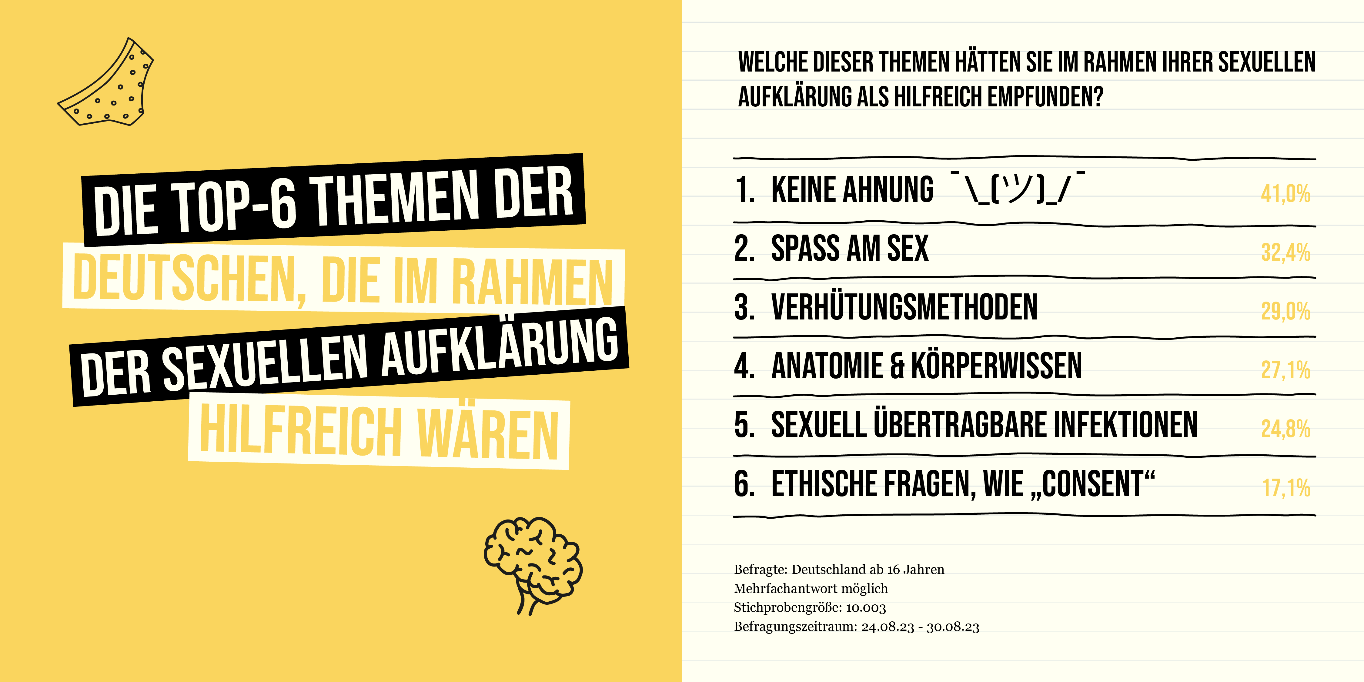 • Bei der Frage, welche Themen in der Schule fehlten, bleiben meist keine Wünsche offen – außer, wie man eigentlich Spaß am Sex hat. Gerade den Generationen zwischen 16 und 39 Jahren ist der ethische und achtsame Umgang mit Sexualität wichtig (31,5 % bei 16- bis 29-Jährigen, 30,9 % bei 30- bis 39-Jährigen), zudem ist hier das Interesse an sexueller Orientierung und Geschlechtsidentität größer (25 % bei 16- bis 29-Jährigen, 20,8 % bei 30- bis 39-Jährigen).