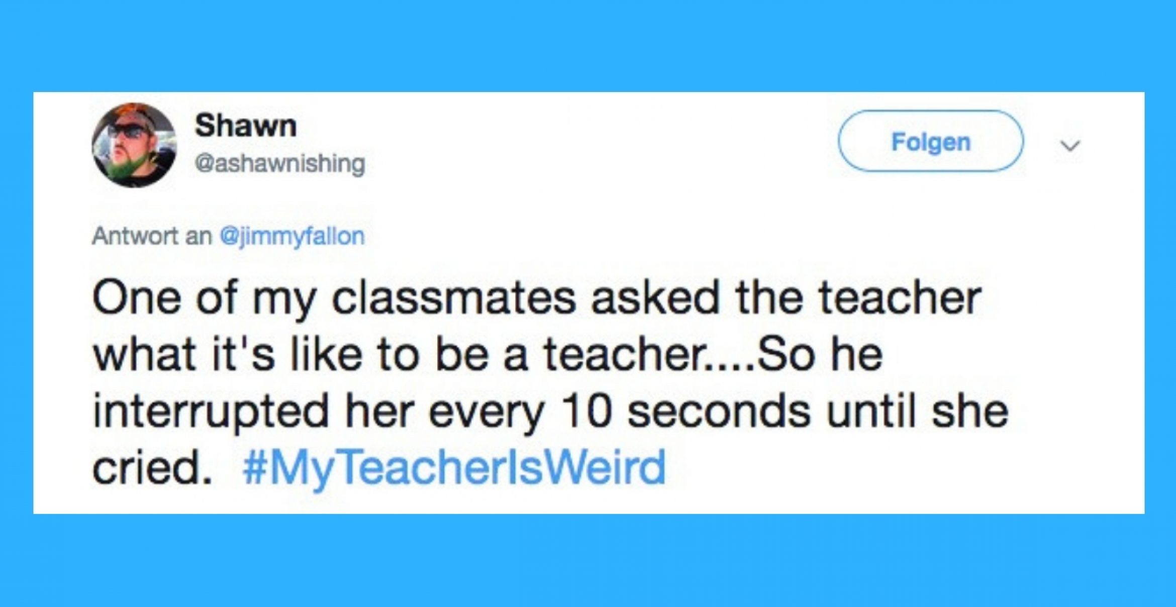 Dass Jimmy Fallon Hashtags mag ist bekannt. Nicht immer sind die entsprechenden Segmente in seiner Late-Night-Show superwitzig. Manchmal trifft er aber mit seinen Hashtag-Aufrufen ins Schwarze. Da lohnt es zuweilen, die Kuh ab und zu mehrmals zu melken. So wie bei #MyTeacherIsWeird, das Fallon 2016 schon mal gestartet hatte. Aber der Bedarf an Lehrern ist auch zwei Jahre später noch ungebrochen, und weshalb sollten Pädagogen plötzlich weniger weird sein? Aber ganz ehrlich: Wer sich dem pubertären Wahnsinn täglich stellt, dem darf auch mal ein Rädchen locker werden.
