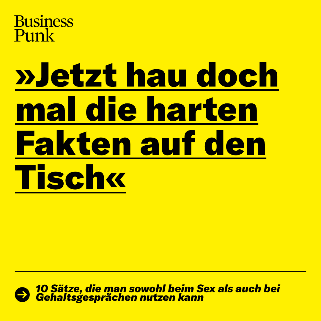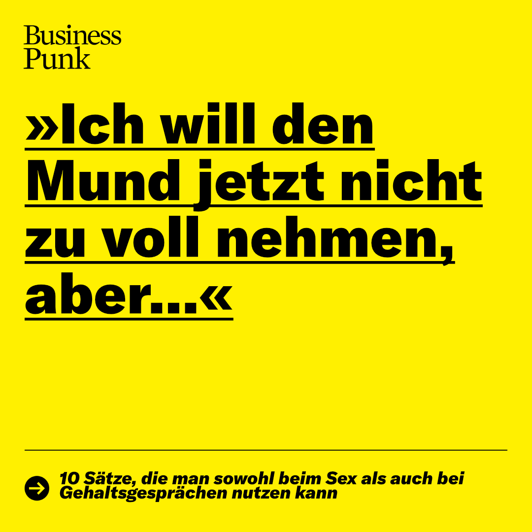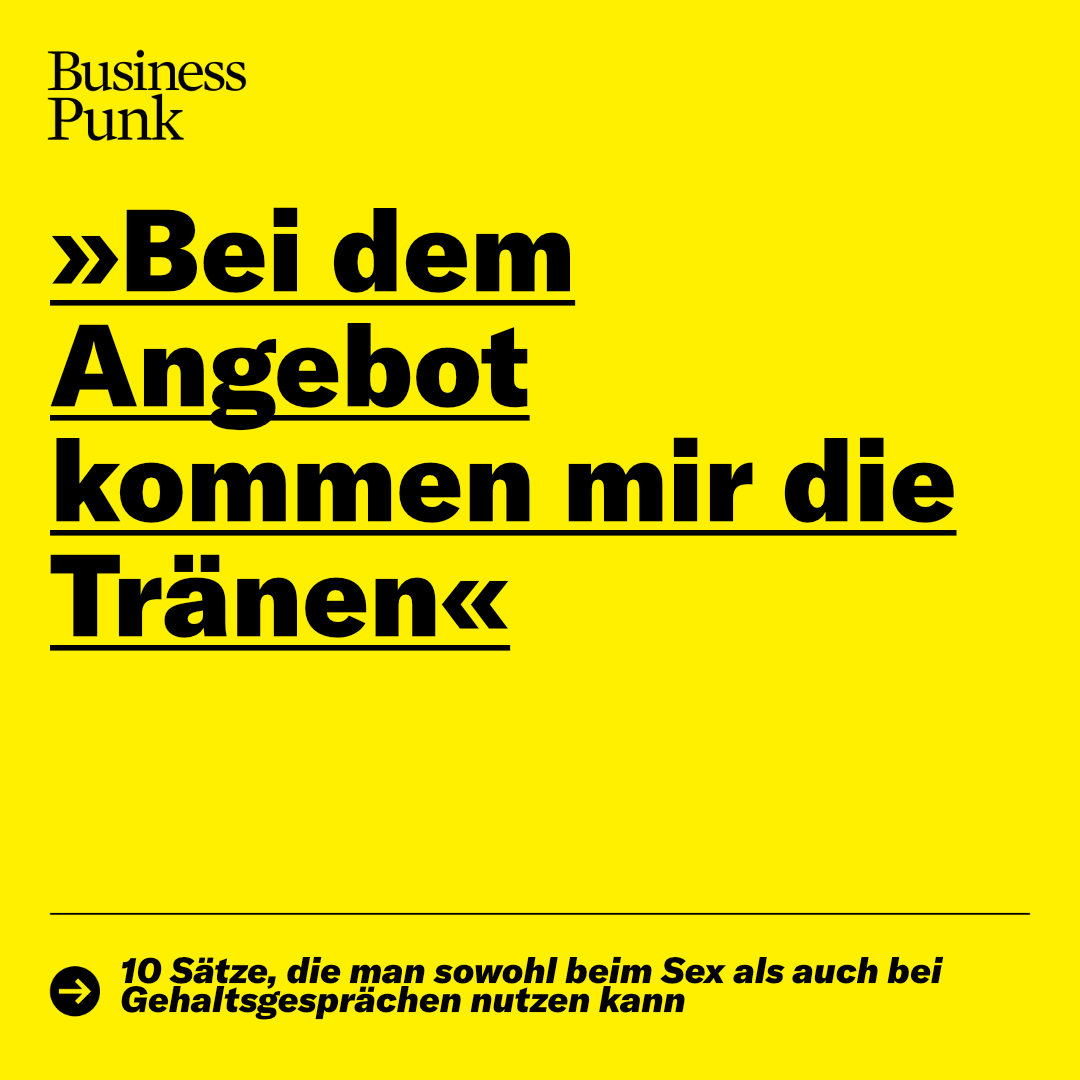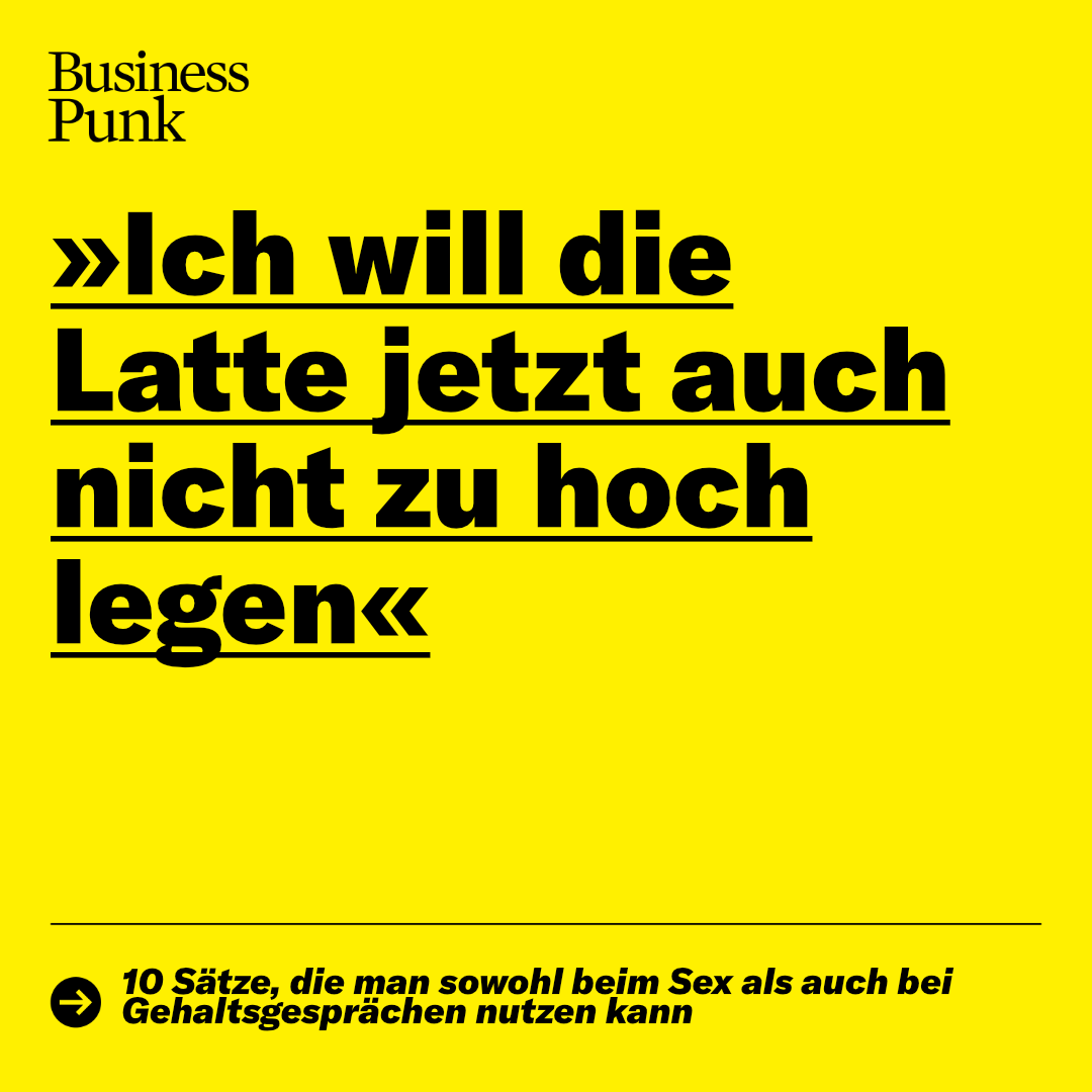 Dabei gibt es doch so viele Sätze, die man sowohl beim Sex als auch der Gehaltsverhandlung zum Gegenüber sagen kann. Wir haben für euch zehn davon von allen Redakteur:innen im Team zusammengesammelt. Damit euch beim nächsten Gehaltsgespräch auch bei unterirdischen Angeboten nicht die Luft weg bleibt. Und damit das nächste Tinder-Date auf alle Fälle unterhaltsam wird.