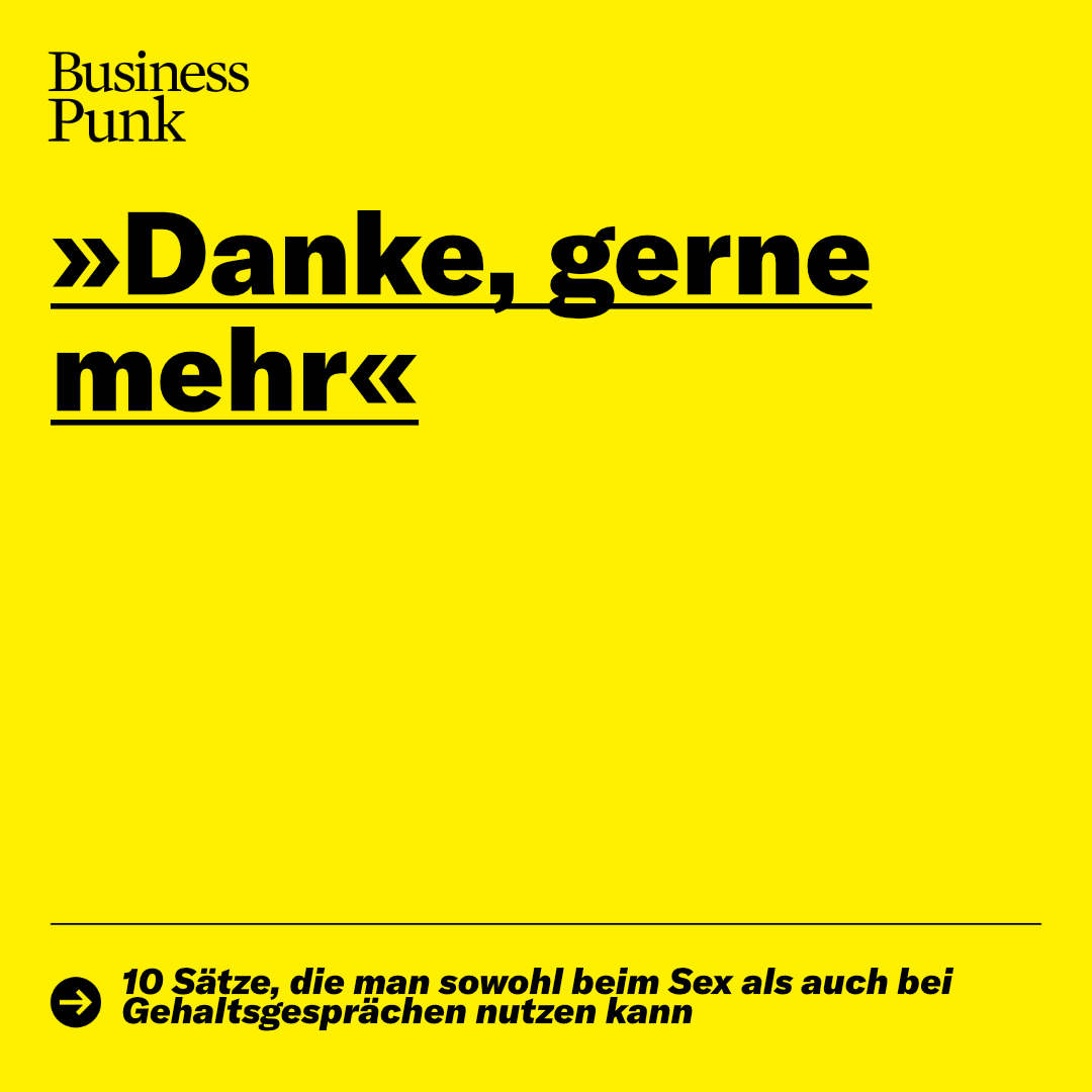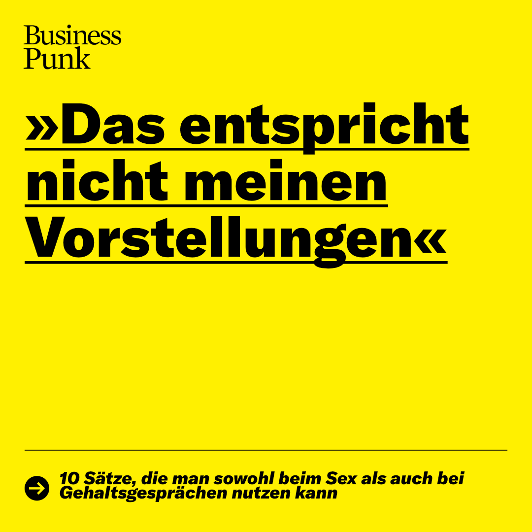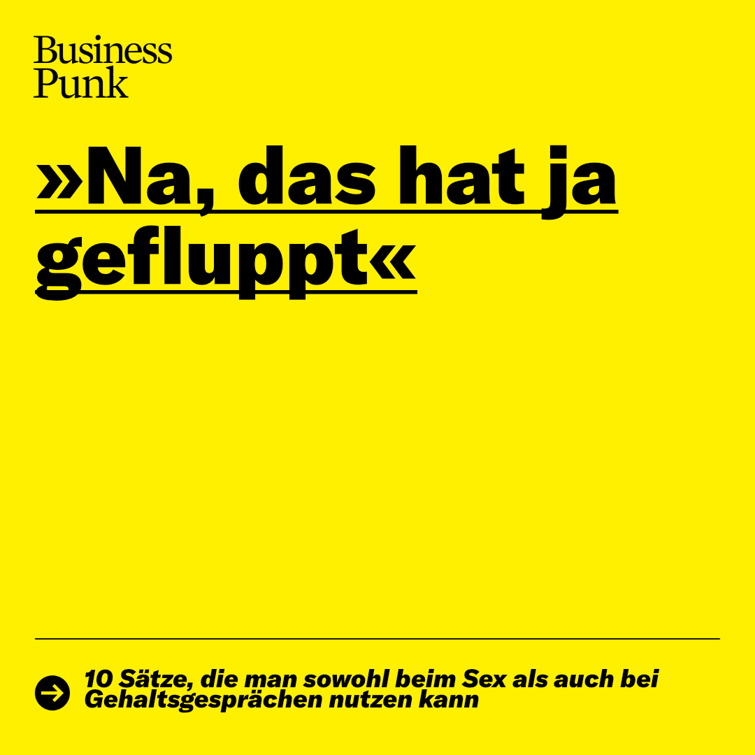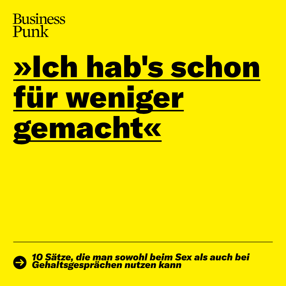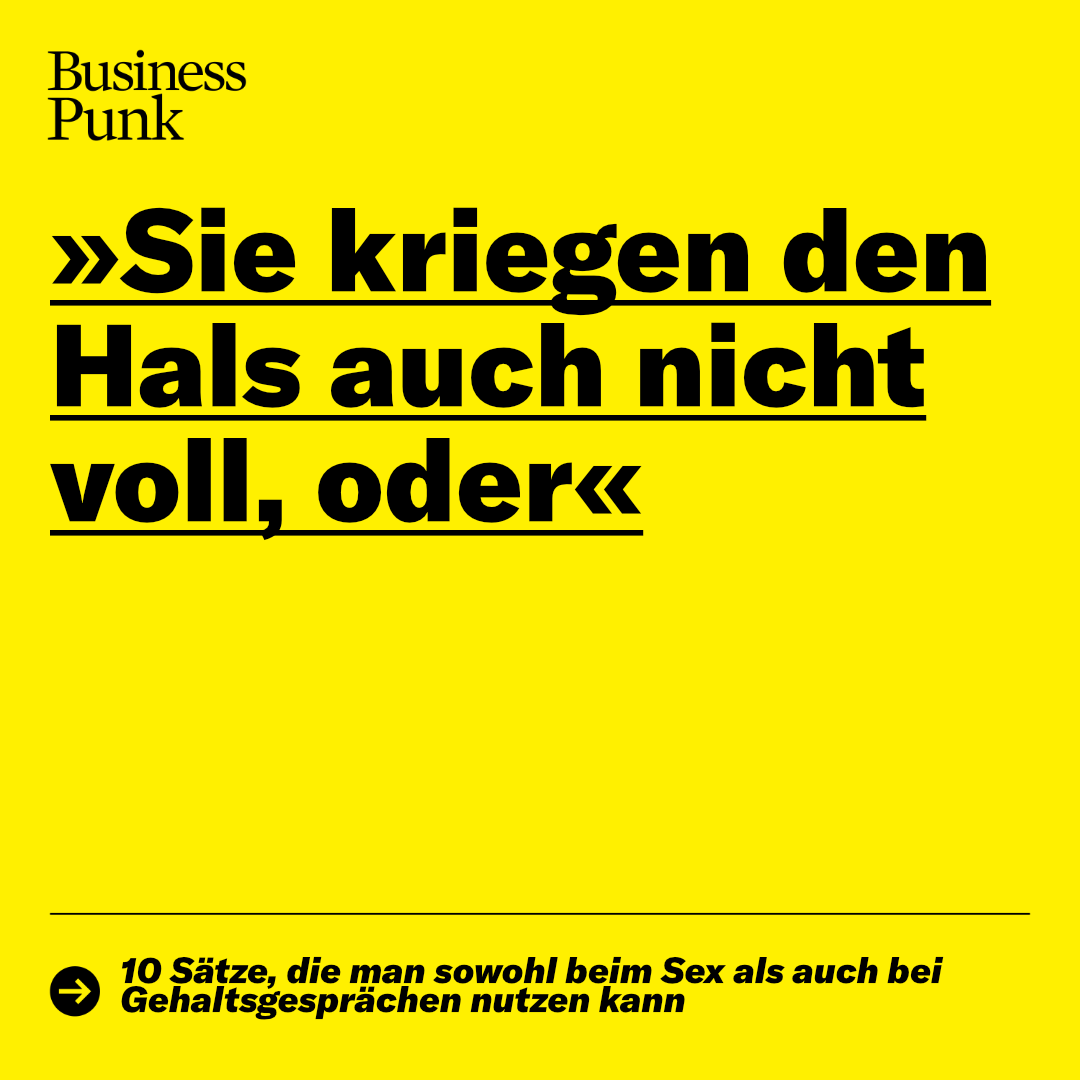 Dabei gibt es doch so viele Sätze, die man sowohl beim Sex als auch der Gehaltsverhandlung zum Gegenüber sagen kann. Wir haben für euch zehn davon von allen Redakteur:innen im Team zusammengesammelt. Damit euch beim nächsten Gehaltsgespräch auch bei unterirdischen Angeboten nicht die Luft weg bleibt. Und damit das nächste Tinder-Date auf alle Fälle unterhaltsam wird.