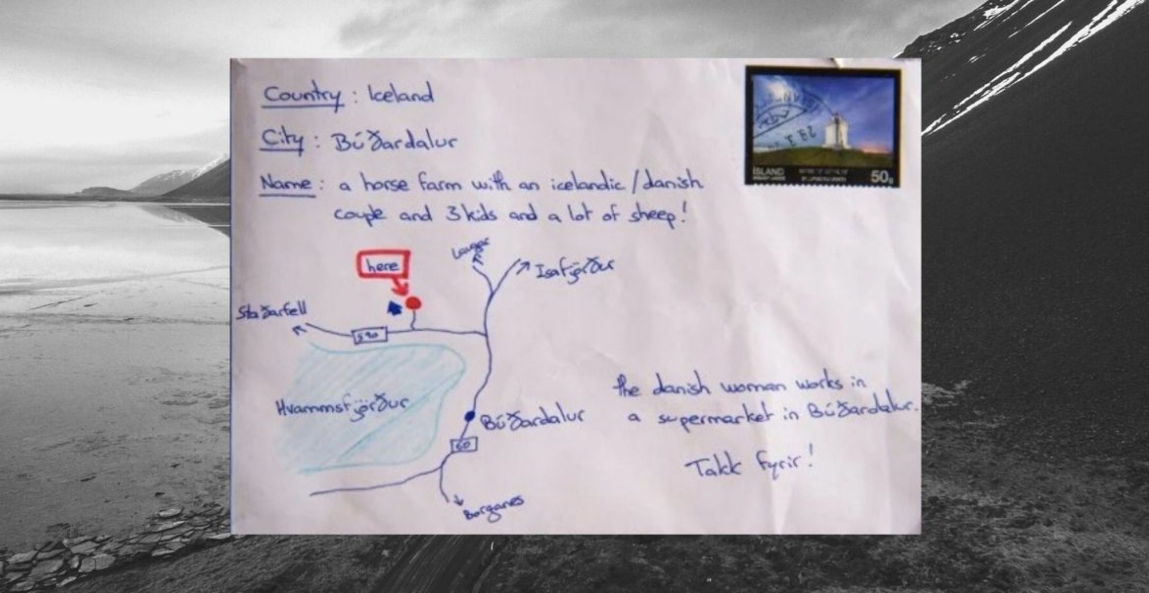 Die Person wusste noch genau, wo sich die Pferdefarm befindet, auf der sie wahrscheinlich ihre Zeit in Island verbracht hat. Also zeichnete sie die Farm in einer Skizze ein und schrieb dazu, wo die Frau arbeitet, die mit ihrer Familie auf der Farm ansässig ist. Der Brief ist tatsächlich angekommen.