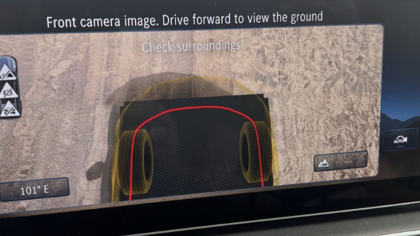 Bei der Abfahrt werde ich übrigens zum ersten Mal auf die „gläserne Motorhaube“ aufmerksam. Einfach erklärt: Im Offroad-Modus gibt es die Funktion „transparente Motorhaube“, die Hindernisse wie große Steine oder tiefe Schlaglöcher auf dem Fahrweg besser erkennbar macht. Fragen Sie mich nicht, wie so etwas technisch funktioniert, der Effekt ist in jedem Fall spektakulär. Der Blick durch den Motor auf die Straße schützt auf jeden Fall vor dem ein oder anderen spitzen Stein!