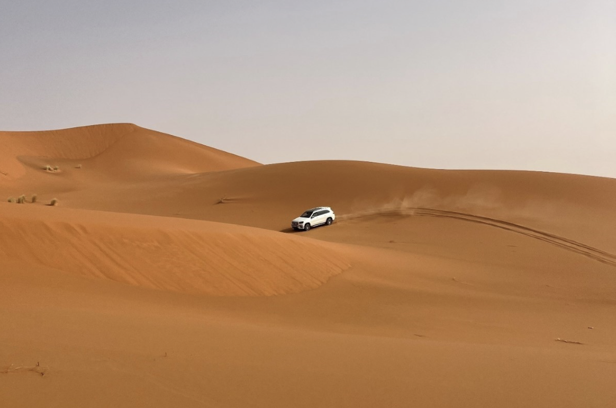 Hier darf ich die ein oder andere Düne allein hoch- und runterfahren, mit der genauen Ansage: „Gas geben und bitte nicht abbremsen!“ Doch das ist nur die Pflicht, was folgt, ist die Kür: Eine professionelle Fahrerin übernimmt, und es ist schwer zu beschreiben, wie es sich anfühlt, mit so einem Fahrzeug meterhohe, golden schimmernde Dünen hoch und runter zu brettern. Ich bin jedenfalls sehr dankbar für diese Erfahrung und denke mir: WOW – der GLS hat’s echt drauf. Wir bleiben jedenfalls nicht stecken!