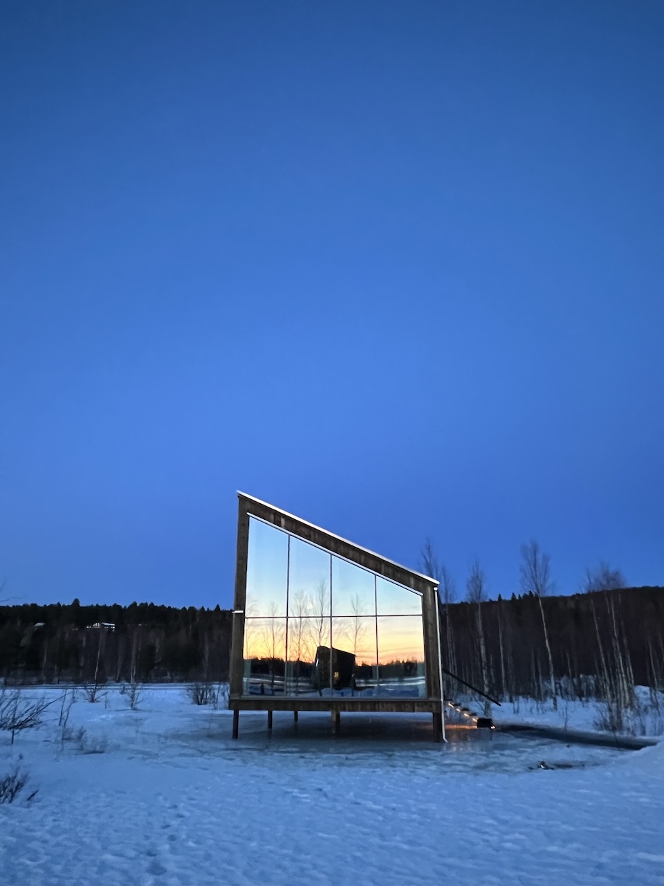 Die Fahrt des ersten Tages endete mit einem wunderschönen Sonnenuntergang am Fluss Luleälv, wo das Hotel Arctic Bath liegt. Einzelne Holz Bungalows mit großen Glasflächen, stehen im zugefrorenen Fluss. Rückblickend war das Raumgefühl in den geräumigen, minimalistische Bungalows wie im EX30 sitzen, mit seinem großen Panoramadach. Um die Entwicklungs- und Design Stories hinter dem Endprodukt zu verstärken, hatte sich das Volvo Team viel, schwedische Stimulation für unsere Sinne einfallen lassen.  Sauna und Icebad im 0,5 Grad frischen Lulealv Fluß, dem Aufenthalt in den Artic Bath Bungalows oder den Tree Hotel Baumhäusern, den Nachspaziergängen durch den Wald oder Atemübungen. Die Polarlichter morgens um 02:30 Uhr hat nur ein ehrgeiziger Kollege erwischt, Elche und Rentiere waren mir auch nicht gegönnt, dafür ein Eichhörnchen – small but mighty.