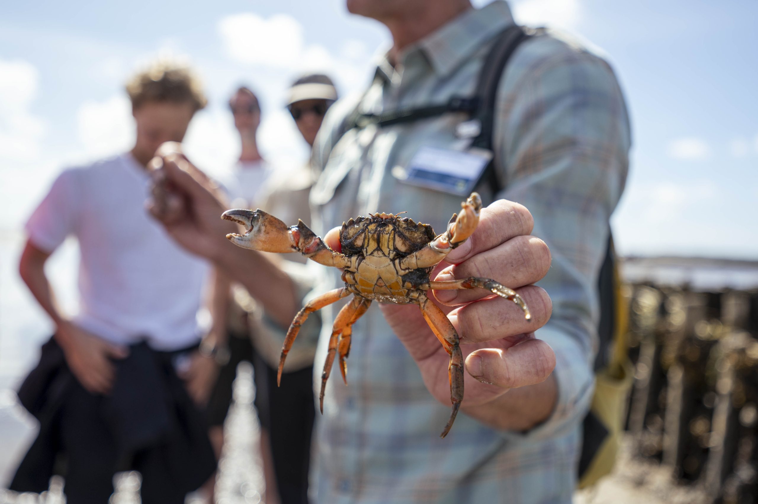 Strandkrabbe: Not amused, aber nach einem kurzen Auftritt von Wattführer Jan Krüger wieder glücklich in ihrem Element. Foto: Defender.