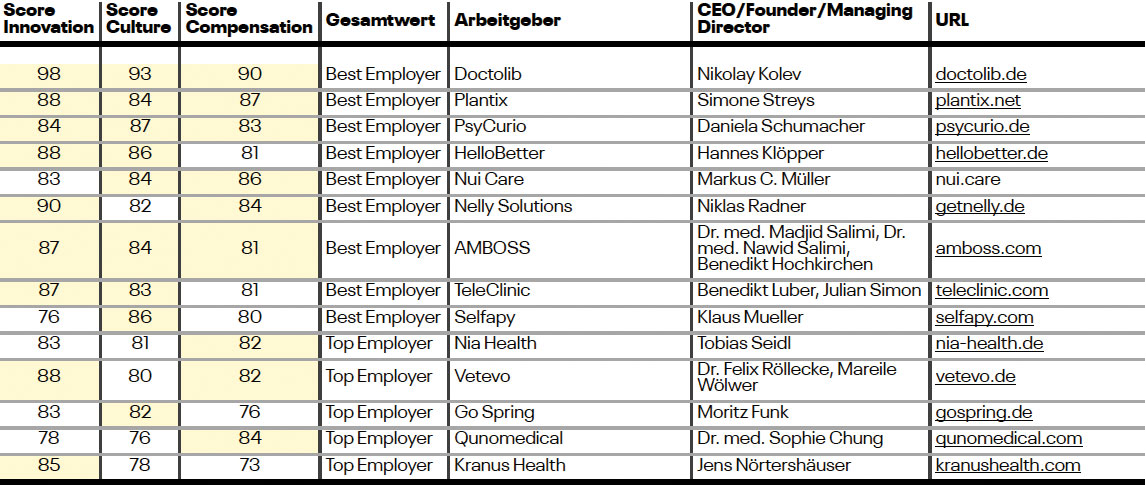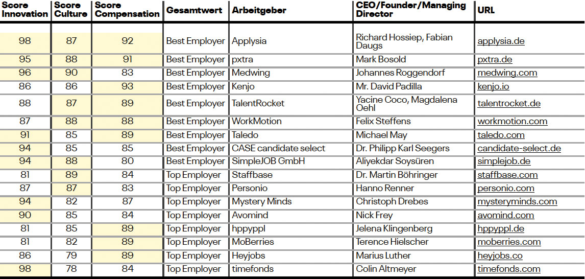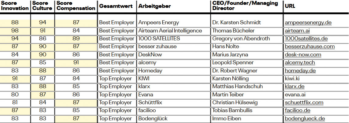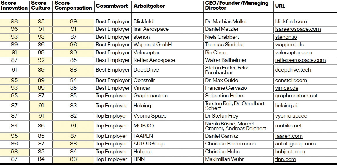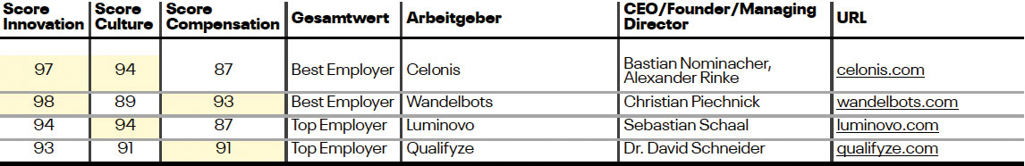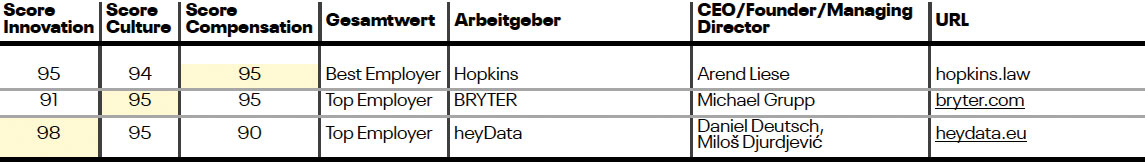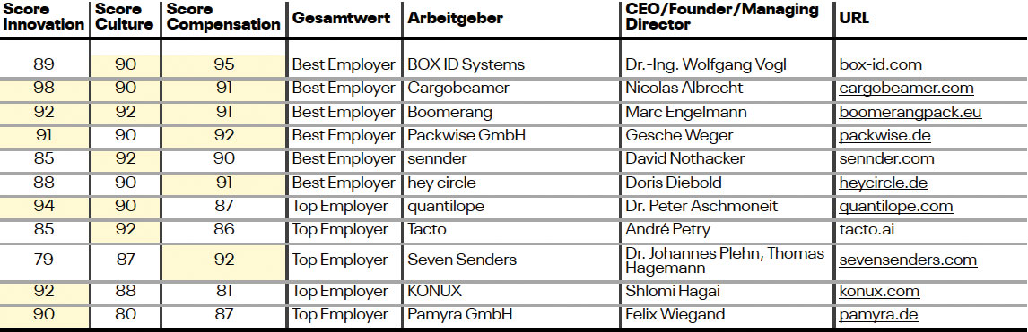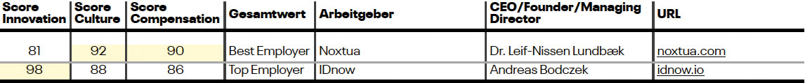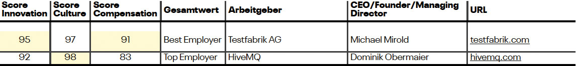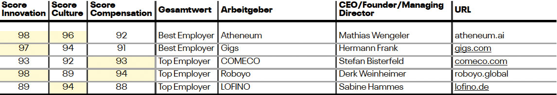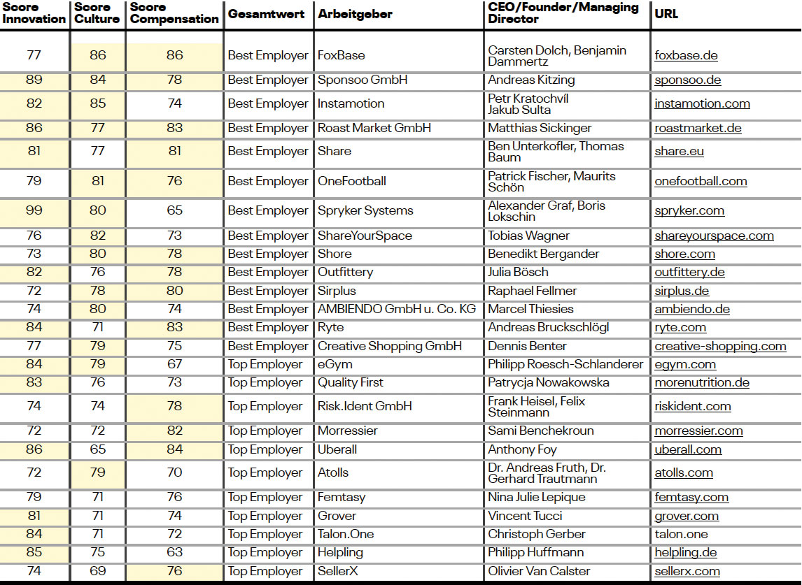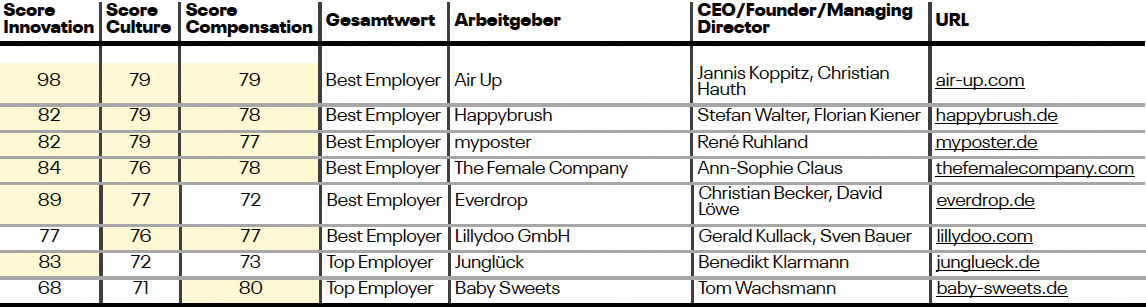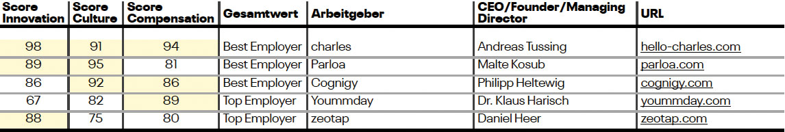 Nachfolgend Seiten findet ihr eine Übersicht der Start-up-Arbeitgeber, die mehr als 30 Bewertungen erhalten haben, sortiert nach Branche, versteht sich. Neben den Scores in Innovation, Culture und Compensation steht bei manchen die Auszeichnung „Best Employer“. Diese gab es für die besten 30 Prozent. Wer in einem Bereich zu den besten zählt, darf sich „Top Employer“ nennen.