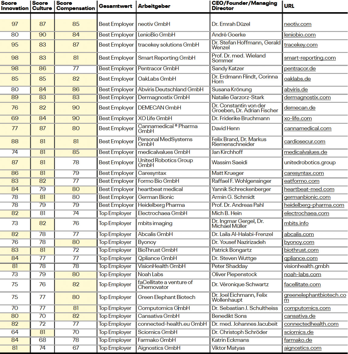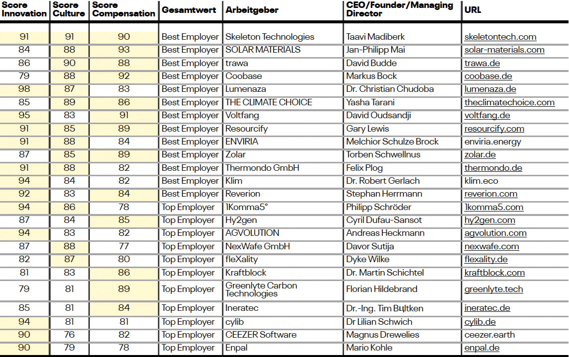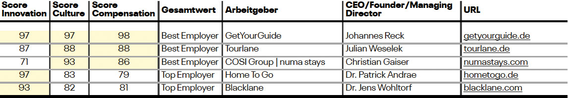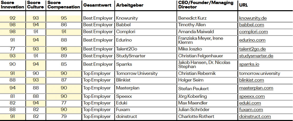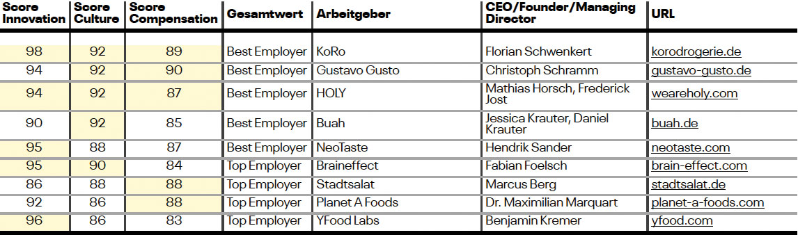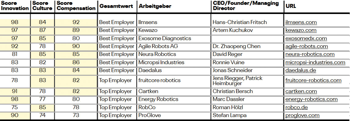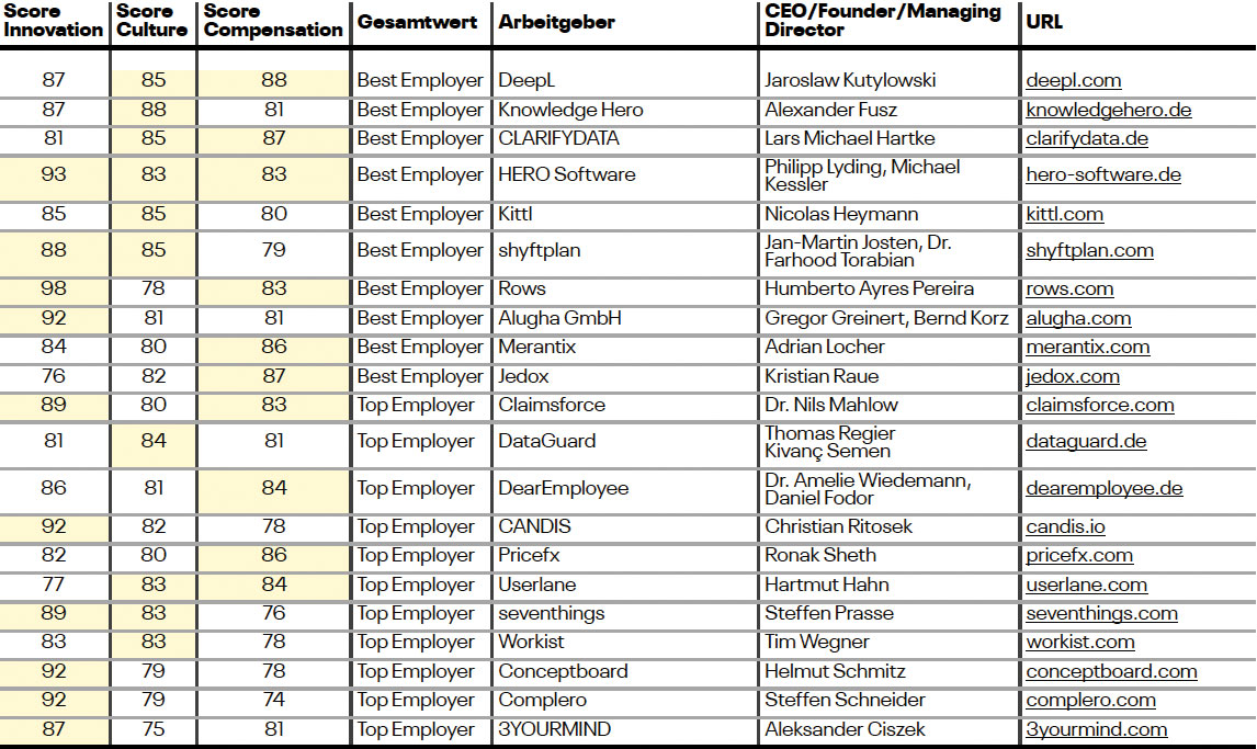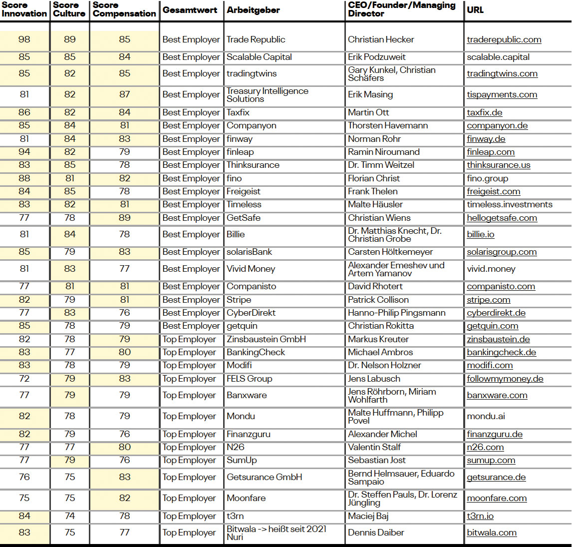 Nachfolgend Seiten findet ihr eine Übersicht der Start-up-Arbeitgeber, die mehr als 30 Bewertungen erhalten haben, sortiert nach Branche, versteht sich. Neben den Scores in Innovation, Culture und Compensation steht bei manchen die Auszeichnung „Best Employer“. Diese gab es für die besten 30 Prozent. Wer in einem Bereich zu den besten zählt, darf sich „Top Employer“ nennen.