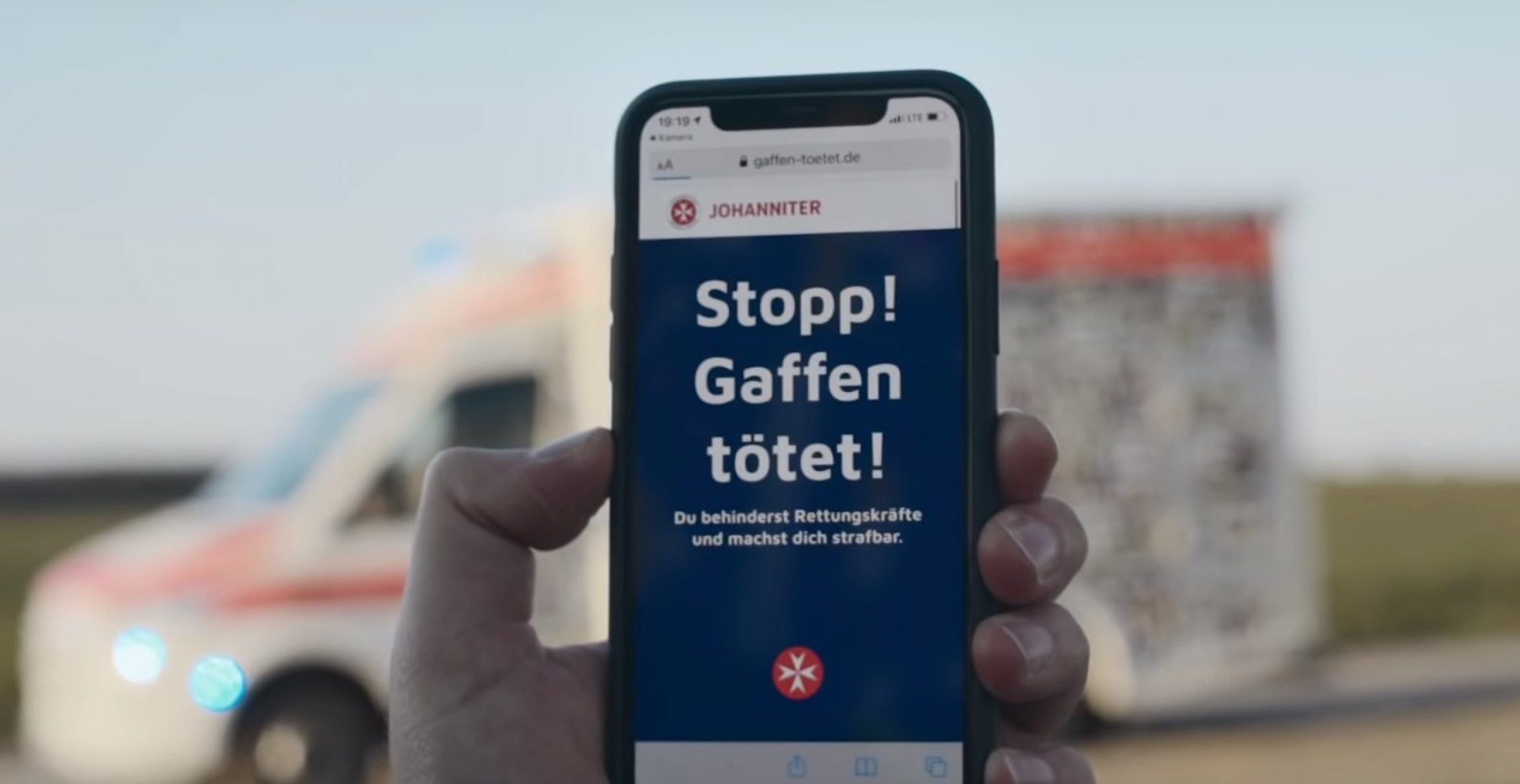 Die Agentur Scholz & Friends hat sich jetzt etwas überlegt, um in solchen Situationen einen sehr deutlichen Warnhinweis zu kommunizieren. In dem Pilotprojekt ist eine Art QR-Code auf die Fahrzeuge und Ausrüstung der Johanniter gedruckt. Hält man das Smartphone drauf, erscheint die Aussage „Stopp! Gaffen tötet!“ – im Kamapgnenvideo wird es nochmal ausführlicher erklärt.